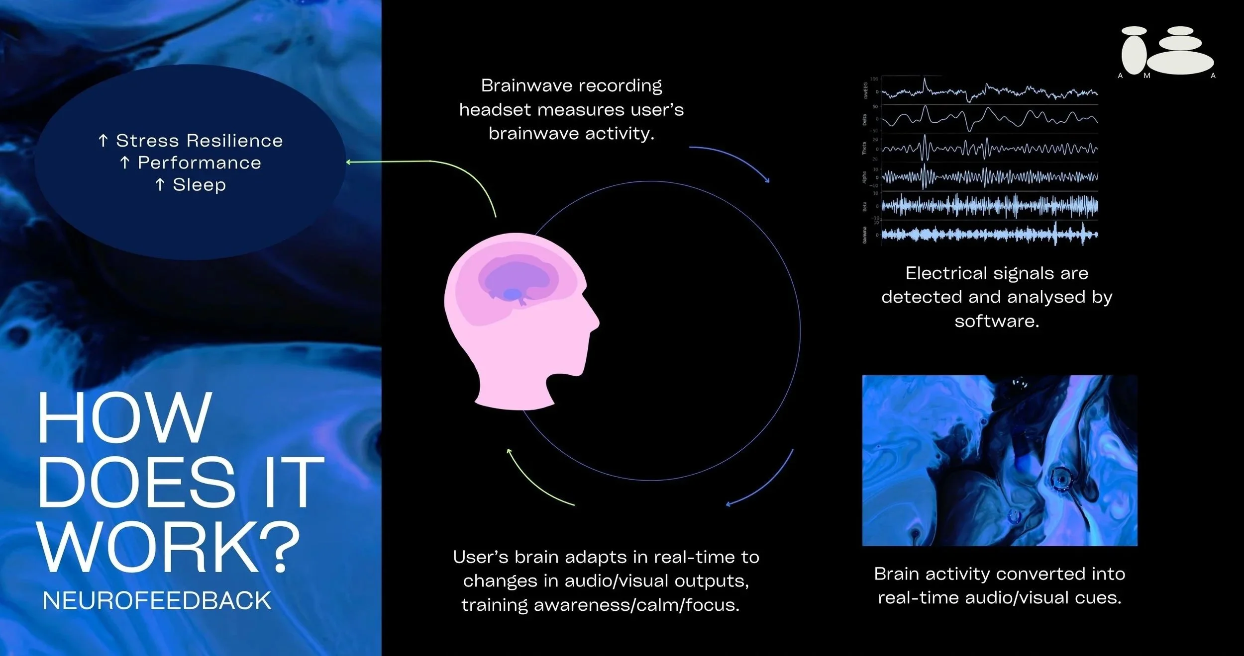 In practical terms, EEG sensors placed on the scalp continuously read the brain's electrical activity. That signal is processed by software, and when the brain produces the target pattern (a frequency associated with calm focus, relaxed attention, or deeper rest, depending on what's being trained) it receives an immediate reward cue: the audio gets louder, the screen brightens. When the brain drifts from that pattern, the feedback stops. Over repeated sessions, the brain learns to orient itself toward the rewarded state, and those patterns gradually become its new baseline, so the brain learns how to get into these optimal states independently.